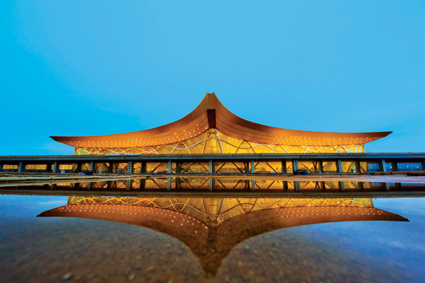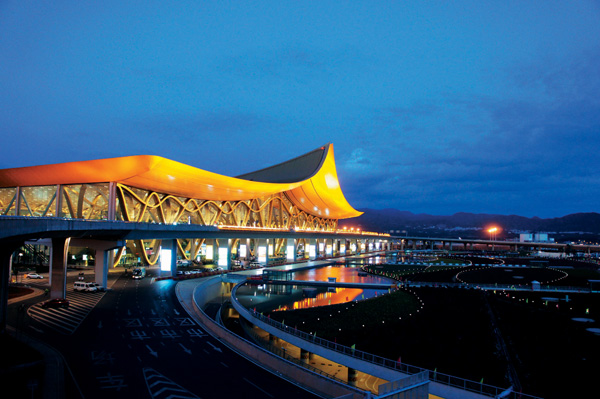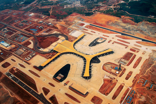 一、工程概况 昆明新机场位于昆明市官渡区大板桥镇,距市中心约24.5km,距小江地震带12km,其±0.000m相当于绝对标高2102.85m。 飞行区本期按4F标准建设东西两条跑道,东跑道长4000m、宽60m,西跑道长4000m、宽45m,两条跑道中心线间距1950m,场道总面积293万㎡。 航站区工程总建筑面积71.58万㎡,其中航站楼54.83万㎡(含屋面挑檐3.223万㎡、登机桥固定端1.23万㎡、地下结构架空层5.53万㎡),站坪停机位84个,可停泊空客A380等大型客机;停车楼16.74万㎡,楼前高架桥7.3万㎡。 设计目标为2020年旅客吞吐量3,800万人次,近机位数量68个。 工程于2008年4月30日开工建设,2012年6月28日竣工,总投资180.57亿元。