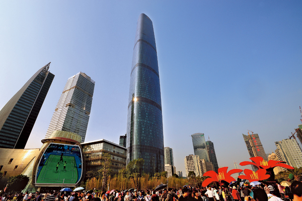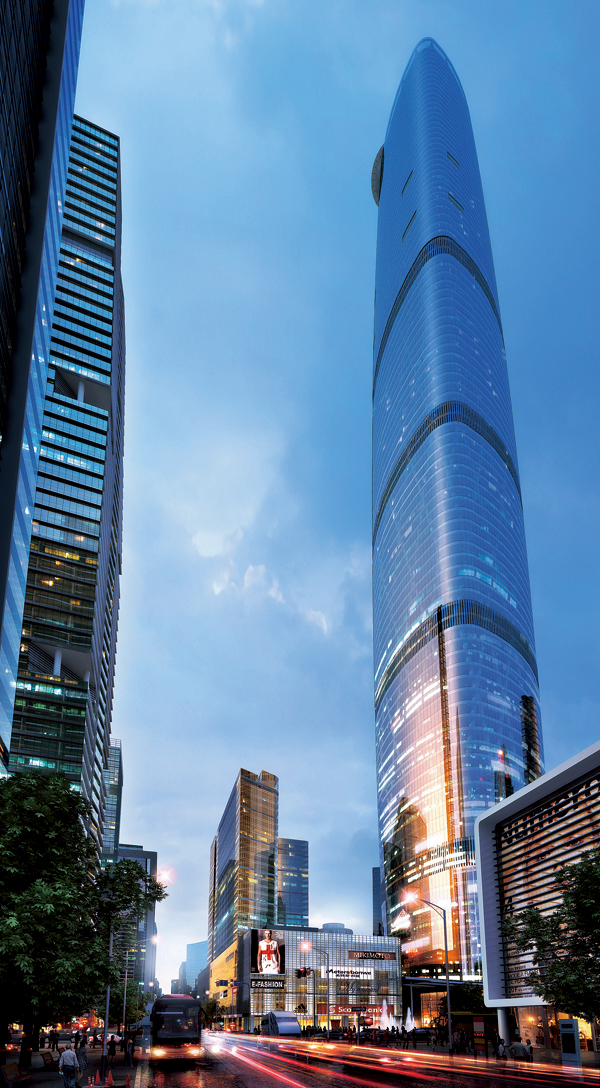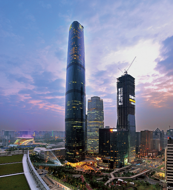 一、工程概况 广州珠江新城西塔(广州国际金融中心、广州西塔)位于珠江新城核心金融商务区,是集办公、酒店、休闲娱乐为一体的综合性商务中心。总用地面积31,084㎡,建筑总面积454,331㎡,建筑总高度440.75m,分为主塔楼、附楼、裙楼和地下室四部分。主塔楼103层,建筑高度440.75m。附楼由两座塔楼组成,塔楼28层,建筑高度99.8m。裙楼5层。地下室4层,局部5层。主塔楼(1~103层)工程结构为钢管混凝土柱斜交网外筒+钢筋混凝土核心筒;附楼(1~28层)工程结构为框支剪力墙结构。基础类型为混凝土灌注桩和天然地基+抗拔锚杆。 主塔楼1~66层为智能化超甲级写字楼,67~103层是五星级酒店——四季酒店;附楼两座塔楼(6~28层)为套间式办公楼;裙楼为友谊商场和四季酒店宴会厅、会议中心;地下室是车库及设备用房。 工程于2005年12月26日开工建设,2012年6月30日竣工,总投资50亿元。