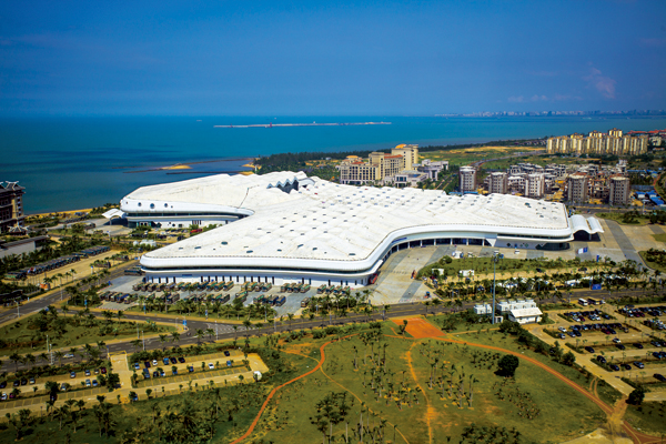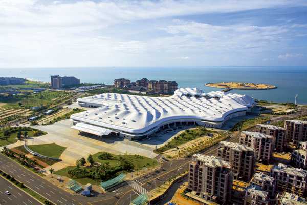 一、工程概况 该工程是海南省、海口市2008年重点建设项目,是大型展览与大型重要会议场所,位于海口市西海岸,分为展览中心和会议中心,为以会议和展览活动为主、兼顾与会议、展览有关的其他展示、演示、表演、宴会以及市民或旅游者日常休闲、旅游、参观、体育等商业活动功能的大型综合会展中心,总建筑面积13.6万㎡。 会议中心为多层建筑,建筑面积4.2万㎡。屋盖采用钢桁架、钢网架和混凝土结构组成,屋面为外曲内折的钢筋混凝土结构,由多个规则不一的正反锅底及曲形海浪状的无规则弧形混凝土梁板组成,檐口高度27.7m,结构梁最大跨度达27.3m,屋顶起伏高差最大达15m,最陡峭处结构坡度达70°。 展览中心为单层建筑,建筑面积7.8万㎡。屋盖由钢网壳、网架、梯形桁架结构组成,檐口高度15.6m,总用钢量约为1.4万t。其中在展厅中部,采用由22m×22m跨度的正向和反向的单层钢管网壳组成的双向空间钢架;在展厅周边,采用曲面的三层网架,柱网间距22m×22m,柱子采用钢管混凝土柱。 桩基础为PHC管桩,地下车库及设备机房为框架剪力墙结构,建筑面积1.6万㎡;屋面设置智能采光通风天窗,面层为现浇GRC;外围采用单元式LowE中空玻璃幕墙和石材幕墙;机电工程设有给水排水、电气、通风空调、电梯、智能建筑五大部分。 工程于2009年11月20日开工建设,2011年6月14日竣工,总投资9.8亿元。
