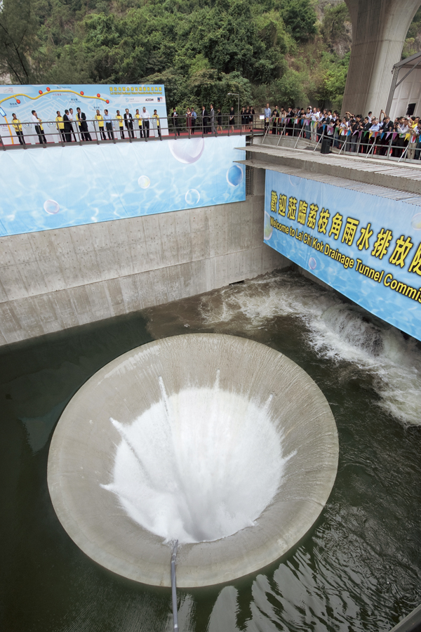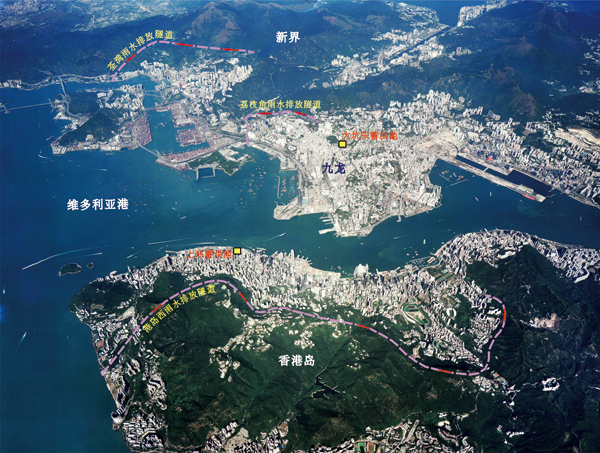 一、工程概况 香港市区截流蓄洪工程,是香港历来最大的排洪计划。工程包括建造三条共长20km,设计总排水量达每秒460m³的雨水排放隧道,及两个位于市区地下,总贮水量为109,000m³的蓄洪池。雨水排放隧道的设计雨量重遇期为二百年,而隧道建成后下游市区将可抵御五十年一遇的暴雨。 “港岛西雨水排放隧道”横跨香港岛,沿半山兴建,主隧道长11km,内径为7.25m。“荔枝角雨水排放隧道”位于九龙西北部,隧道全长3.7km,由一段2.5km长沿半山兴建的分支隧道,及一段1.2km长贯通荔枝角市区地底的主隧道组成,内径为4.9m。“荃湾雨水排放隧道”穿越新界大帽山南面,长5.1km,内径为6.5m。“大坑东蓄洪池”位于九龙北部,贮水量达100,000m³。“上环蓄洪池”位于香港岛上环低洼地区,容量为9,000m³。 三条雨水排放隧道及两个地下蓄洪池相互配合,为香港市区多个沿岸地方,包括主要商业中心及稠密商住区域,提供长远有效的防洪保障。截流蓄洪成效显著,大大提高了香港地区的防洪能力和标准,有效地减轻了城市的洪涝灾害,在近年的多次暴雨中未出现内涝现象。 工程于2001年1月开工建设,2012年6月竣工,总投资70亿港币。