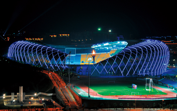 一、工程概况 该工程是第九届全国少数民族传统体育运动会主会场,位于贵州省贵阳市金阳新区,是集体育竞赛、训练培训、休闲商务、旅游、大众健身等功能为一体的大型生态体育公园。体育场下部为钢筋混凝土框架结构,上部罩棚采用体外预应力大悬挑斜向交叉钢桁架结构。总建筑面积77283㎡,由地上6层体育场和地下2层车库组成,设计坐席51636座,为甲级体育场。东西看台顶标高分别为49.05m和52.25m,屋盖罩棚最大悬挑长度49m。 该工程地处岩溶地质环境,设计为依山建造体育场看台+体外预应力超限悬挑钢结构罩棚结构体系,基础采用人工挖孔桩、桩承台+拉梁,基岩露头处采用独立基础;上部结构采用钢筋混凝土现浇斜框架结构,看台高端局部采用钢筋混凝土框架,钢罩棚采用了超限悬挑斜交双曲面管桁架体系,其分布于主体育场东、西看台,由墙面桁架、屋面桁架、转换桁架、端桁架、边桁架组成。 工程于2009年1月15日开工建设,2011年3月31日竣工,总投资9.2亿元。