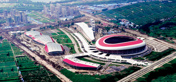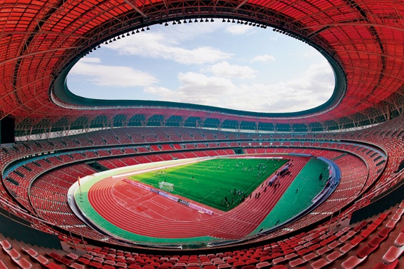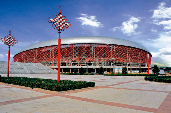 一、工程概况 该工程是山西省目前规模最大的公共体育场馆,建筑造型取山西民间大鼓之形、灯笼之构、剪纸之饰为创意元素,平面为椭圆形,总建筑面积90066㎡,地上5层,建筑总高度55.643m,共设置上、中、下三层看台,共6万坐席。 工程基础采用钢筋混凝土灌注桩基础。顶部为东西高、南北低的曲面弧形悬臂空间三角形钢桁架结构,罩棚外边缘南北长293m,东西宽275m,钢结构主桁架最大悬挑长度约为52m,最小悬挑长度约为34.7m。下部为钢筋混凝土框架剪力墙结构。比赛场地为标准田径场地和标准足球场地。主体育场室内设置了功能完备的运动员赛前休息活动室、热身场地、办公区、新闻发布厅、会议室、移动通信机房等各种功能用房。 工程于2009年6月1日开工建设,2011年6月1日竣工,总投资7.9亿元。