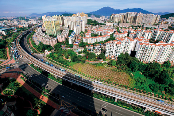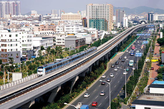 一、工程概况 深圳地铁三号线(又称龙岗线)分为一期工程和西延段工程两部分,线路全长约41.7km,采取高架、地面、地下三种不同方式敷设,其中地下线17.364km,高架线21.809km,地面线(含过渡段)2.493km。全线车站30座,主变电所2座,车辆段和停车场各1座。该工程克服了敷设方式多样、地质条件复杂,工期紧等重重困难,突破了传统管理模式,大胆创新,在轨道交通建设中首次应用多项管理理念和技术创新成果,节省直接投资上亿元。在生态环保、节能减排、节约土地、降低运营成本等方面具有示范效应。 工程于2007年开工建设,2011年6月竣工,总投资171.05亿元。