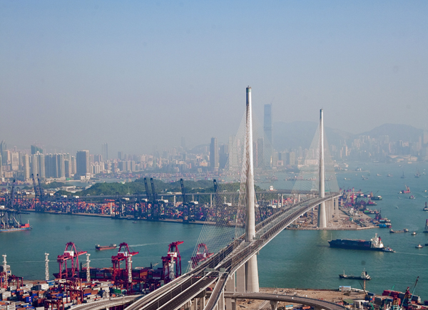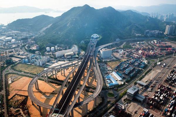 一、工程概况 香港青沙公路由昂船洲大桥、昂船洲高架路、青衣东高架路、青衣西高架路、荔枝角高架路、南湾隧道、尖山隧道、沙田岭隧道、大围隧道组成,全长约13.5km,是双程三线分隔行车的高速公路。青沙公路连接于1997年开通的赤腊角至青衣段,组成一条长约28km的高速干线,连接新界大屿山赤腊角和沙田。 青沙公路于2002年4月10日开工建设,分两阶段进行,沙田至长沙湾段(包括尖山隧道、沙田岭隧道及大围隧道)在2008年3月开通,沙湾至青衣段(包括昂船洲大桥及南湾隧道)在2009年12月20日开通,工程总投资185亿元。 昂船洲大桥主跨1018m,是现时全球跨度第二长的斜拉桥,桥型设计与维多利亚港的景观浑然一体,高耸的独柱式桥塔的上半部由独特的不锈钢和混凝土复合结构组成,流线型的分隔式桥身令大桥在受强风吹袭时更加稳定,其景观照明系统在夜幕下突显大桥的建筑特色。