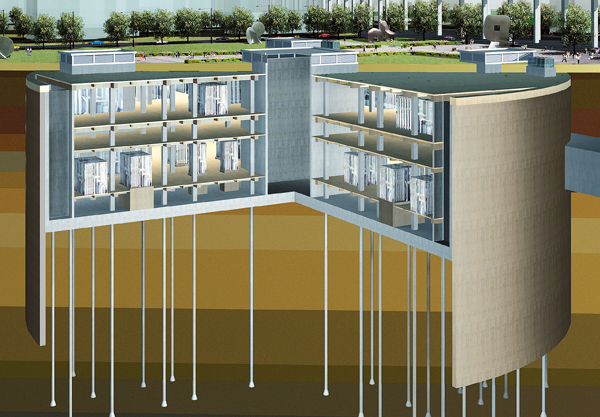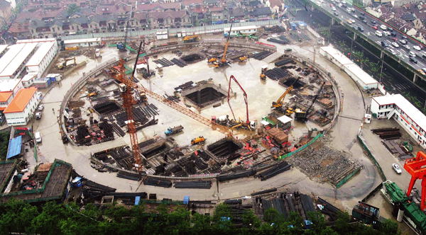 一、工程概况 上海静安输变电工程位于上海市中心城区,是国内首座将500kV电源引入大都市中心区域的地下超高压变电站,是2010年上海世博会的重要配套工程,用于缓解上海中心城区的供电压力和保障2010年世博会的用电。该工程为国内首座、世界第二座大容量超高压全地下变电站。 该工程占地约13300㎡,总建筑面积57615㎡,其中地下建筑面积55809㎡,地上建筑面积1806m2,主体结构地下投资15亿元。全站安装500kV、1500MW变压器两组、220kV、300MW变压器两台,设有六个电压等级。地面部分为大型“雕塑公园”。地下建筑为直径130m、地下四层、埋置深度约34m,与日本东京新丰洲地下变电站(直径140m,深度29m)相比,本工程埋置更深、体量更大、土层更加软弱、位于中心城区环境更为复杂。 本工程采用“地下连续墙两墙合一、地下四层结构梁板替代水平支撑、三道临时环形支撑”的“逆作法”总体方案。地下连续墙厚度仅为1.2m、深57.5m,插入比仅为0.69,内衬墙厚仅为0.8m;基础底板厚2500mm,桩基采用桩端埋深约82m的桩侧后注浆抗拔桩;采用了复杂地下水条件下的深层地下结构成套防水设计方法、节点构造满足地下变电站较高的工作环境要求。