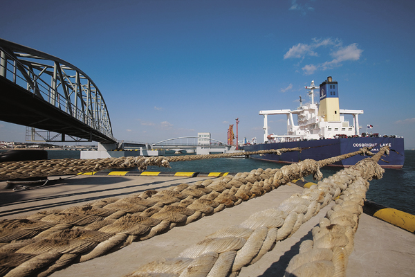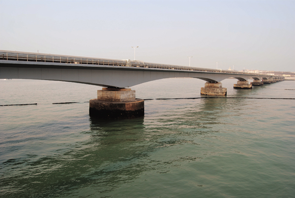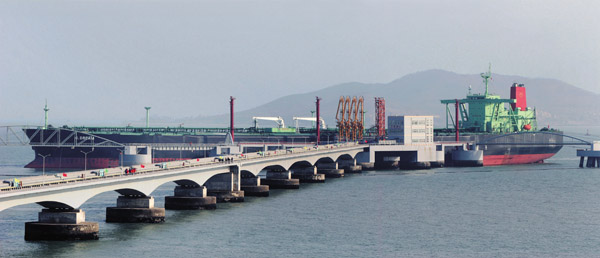 一、工程概况 青岛港原油码头三期工程位于青岛市黄岛区,建设30万t级原油接卸泊位1个及相应的配套设施,码头尺度、结构及工艺系统按45万t级设计(前沿停泊区近期疏浚到30万t级),年设计通过能力为2000万t。工程总投资4.43亿元,于2006年2月开工建设,2007年4月建成试运行,2008年12月完成竣工验收。 本工程是目前国内最大吨级的码头,可以停靠10~45万t级油轮。创造了原油码头吨级、接卸能力、码头前沿水深、混凝土引桥跨度、单联桥长度、沉箱高度、输油管线直径、输油臂参数、卸船效率等多项最新纪录。
