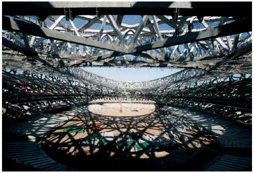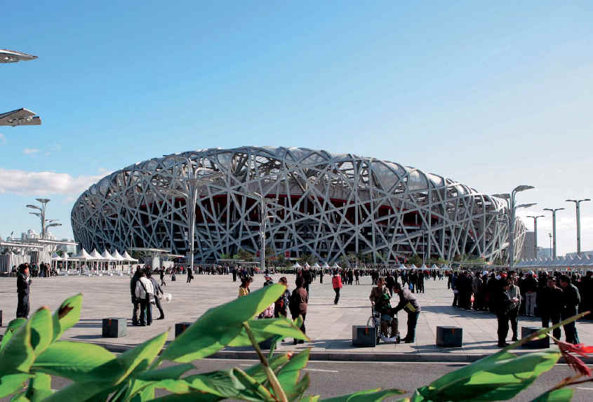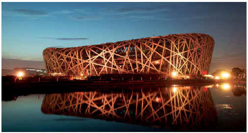 国家体育场是北京2008年第29届奥运会主会场,承担开闭幕式和田径比赛,可容纳观众91000人,工程位于奥林匹克公园中心区,占地面积20hm2,总建筑面积258000m2。体育场建筑造型呈椭圆的马鞍形,南北向长333m,东西向宽280m,外壳由42000t钢结构有序编织成“鸟巢”状独特的建筑造型;钢结构屋顶上层为ETFE膜,下层为PTFE膜声学吊顶。内部为三层预制混凝土碗状看台,看台下为地下2层、地上7层的混凝土框架-剪力墙结构,基础形式为桩基,建筑物高69m。国家体育场装饰装修设计将中国元素、人文关怀、国际潮流相融合,通过不同材料、不同色彩、不同元素的运用,将不同功能分区有机结合在一起。装饰选材及节点构造追求与钢结构造型相呼应,突出新颖奇特与返璞归真相结合的设计理念。工程于2003年12月24日开工建设,于2008年6月10日竣工。 二、新技术应用与科技创新 (1)首次在国内外民用建筑工程领域中以耐久性100年为目标,从设计、施工到检测进行了系统、全面的研究,并应用于本工程中,取得了显著的社会、经济效益,在同类工程中具有重要的推广应用价值。 (2)针对复杂的结构体系,进行了“国家体育场工程矩形钢管永久模板混凝土斜扭柱施工技术与应用”等一系列复杂结构的施工技术研究,很好地解决了施工难题,确保了工程质量,加快了施工进度。 (3)国家体育场基础工程极为复杂,通过现场试桩研究确定桩基设计施工有关参数、成桩工艺、单桩设计参数、桩土共同工作效应和群桩效应,保证了基础桩施工工期、质量。 (4)进行了国家体育场非预应力薄壁预制清水混凝土看台板技术研究,成功应用于国家体育场工程,取得了很好的效果。 (5)采用国内首次试制、批量生产的Q460高强特厚板,并在国际上首次提出了此类钢材110mm厚板的焊接技术。 (6)研究了国家体育场钢结构工程箱形弯扭构件及多向微扭节点制作及应用技术,在建筑钢结构制作领域填补了国内空白,达到了国内外同类研究项目的领先水平。 (7)“国家体育场大跨度马鞍形钢结构支撑卸载技术”填补了国内外大跨度、复杂空间钢结构工程支撑卸载技术的空白,达到了国际先进水平。 (8)研究并成功应用了大体量钢结构、高要求的钢结构防腐技术,取得了很好的工程效果。 (9)建立了国家体育场工程总承包信息化管理平台、工程资料协同管理系统、钢结构信息化系统、4D施工管理系统,采用了视频监控和红外安防系统、雨洪利用系统、空调水管道沟槽连接技术、虹吸屋面排水技术、综合布排平衡技术,进行了紧急状态疏散计算机模拟分析技术、体育场内微气候研究与控制、专业声学设计与模拟、供配电系统关键技术等一系列研究,体现了“绿色奥运、科技奥运、人文奥运”的理念。 (10)首次在国内体育场设计中采用国际上广泛应用于飞机等设计领域的三维CATIA设计软件,开创了在此类软件在我国应用于建筑设计领域的先河。 三、工程获奖