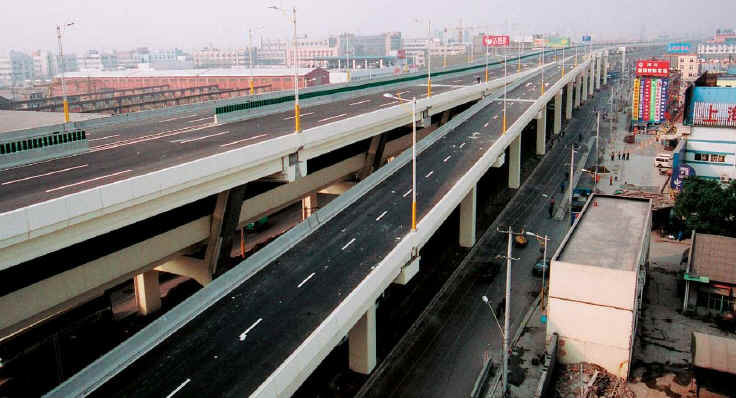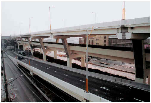 上海市共和新路高架工程是一项重要的交通设施工程。工程包括共和新路高架道路工程和轨道交通1号线北延伸段工程两部分。工程横跨闸北区和宝山区。 共和新路高架道路工程南起中山北路南北高架、内环高架交接处,北至蕴藻浜北与外环蕴川路立交相连,工程全长9.65公里,高架道路标准段为高架六车道。总宽25.5米,梁型采用预制T梁,标准跨径为30米,荷载等级为汽-20,挂-100,设计时速80kM/h,全线设7对半匝道。 轨道交通1号线北延伸段工程起自上海火车站地铁折返段北端,沿大统路、共和新路和蕴川路,至外环线共富新村站终点。正线全长12.43公里。其中地下线路4.05公里,高架线路8.38公里(一体化高架线为5.5公里),全线设9座车站(其中地下站3座,一体化高架车站4座,一般高架车站2座),一体化高架形式为目前国内首条。 高架地铁轨道梁采用基本跨径为30米的预应力混凝土简支箱梁,单室单箱截面,跨径大于35米时采用钢-混凝土简支叠合梁结构。高架道路与高架地铁相结合的一体化高架结构,桥墩以“Y”型为主,主线变宽段采用三柱式“Y”型桥墩,由上而下为高架道路、高架地铁、地面道路。 该工程的主要功能是完善上海高架快速路网,连接内、中、外环线的放射线道路之一。对于缓解城市北部地区交通压力起着举足轻重的作用。轨道交通1号线北延伸段的建成对北部地区的大规模开发奠定了很好的基础。使大运量轨道交通的优势得到充分体现,确保出行的快速、便捷,特别是吸引了客流,能有效减轻地面道路的交通压力,大大改善北部地区的交通条件,工程充分体现以公共交通为主体,以轨道交通为骨干,满足不同交通方式的城市综合交通体系的城市发展总目标。 二、新技术应用与科技创新 (1)采用Y型桥墩将高架道路与高架地铁结合为一体化高架线,节约了土地资源,降低了工程投资,减少了道路两边的拆迁量,改善了城市景观,较好地解决了城市空间综合利用与城市交通功能一体化的问题。Y型桥墩形式结构受力明确,美观新颖,该种结构是充分利用道路空间的成功典范。工程依托科研机构进行了专门的课题研究和设计应用,成果达到了国际先进水平。 (2)采用了地下车站屏蔽门系统、采用节能、安全可靠和运营速度高的多级驱动自动扶梯以及透明玻璃轿的观光式无机房门电梯车站、建筑与整个高架工程形成统一、连贯的整体,布局紧凑、高架车站的站厅、站台采用通透的半敞开式,体现节能环保设计理念。 (3)盖梁整体钢模板采用标准化设计,结构简单、安全可靠、可重复使用、节约了成本,模板支撑系统设计新颖、结构合理、组拼方便,模板安装工艺可行,机械化程度高,盖梁施工期间减少了对地面交通的影响,提高了市政建设的文明形象,取得了明显的社会效益,该项目施工技术首次在国内使用。 (4)为解决三层轨道交通与高架公路一体化T梁吊装施工,在工程环境复杂、施工场地狭小、城市地面交通繁忙且架设高度高、构件重和跨度大等极其困难的施工条件下,创新地解决了架桥机高空拼装技术、斜吊施工技术、架桥机过孔等施工难题,保证了工程顺利进行。该项研究成果是一项针对城市复杂环境条件下的三层高架桥梁架设的适用技术,是常规的高架桥梁施工技术方面的创新和发展。 (5)成功穿越新亚明珠大酒店深层搅拌桩技术:中山北路—延长路车站区间隧道要从新亚明珠大酒店深层搅拌桩下穿越,使得该隧道埋深达25米。施工中在盾构机内加装泡沫发生器,用以加注土壤润滑泡沫剂,从而改良土性,改善土壤可切削性能,减少土体的内摩擦力,使盾构在该深度内出渣顺利并有效地控制了地表沉降。 (6)工程在延长路站-广中路站(马戏城站)首次在国内采用了皮带机连续出土系统,盾构掘进皮带运输机系统依据盾构实际推进施工所需的出土能力和场地环境设计,最大输送长度可达1900米。皮带运输机系统的应用不仅使盾构施工出土工序能够快速、连续、安全,且由于对隧道空间的充分利用,使管片等工程材料的运输得以与出土工序同步进行,极大地提高了生产效益。 三、工程获奖