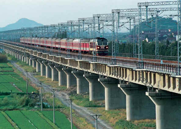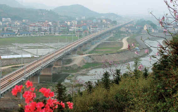 浙赣铁路电气化提速改造工程,东起浙江省杭州市,西至湖南省株洲市,途经浙江、江西、湖南三省,既有线全长942.648km。满足双层集装箱通行条件、行车和调车作业实现远程集中控制,是第一条全面提速到200km/h客货共线的电气化铁路。 主要工程数量:完成路基土石方7764万m3;特大桥22座;大桥52座,中桥85座;隧道34座23046延长米;正线铺轨1103km,站线铺轨141km,铺设道岔1243组;新建10座通信站、66个车站数字调度系统、60个车站无线列调系统;新建浙赣线59个车站计算机联锁及CTC工程;新建10kV配电所20座;架设接触网2952条公里。 主要技术标准:铁路等级:Ⅰ级;正线数目:双线;限制坡度:保留既有7.20‰最小曲线半径(200km/h路段一般3500米,困难情况下2800米,个别2200米);牵引种类:电力;机车类型:客机六轴车,货机八轴车;牵引质量:4000t;到发线有效长:850米;闭塞类型:自动闭塞;建筑限界:满足双层集装箱开行条件。 浙赣铁路是我国“四纵四横”主要干线中南部的重要“一横”,连接我国最重要的贯通南北的京广、京九两大干线。电化提速改造工程后,浙赣铁路运输能力大大提高,牵引质量由改造前的3500t可提高到4500t;平行运行图能力可提高到210对。它已成为长江三角洲与珠江三角洲经济联系的重要纽带,缩短了长三角与珠三角地时空,推动了浙、赣、湘三省工农业生产的发展,方便了沿线人民群众的生活,对国民经济的持续增长意义重大,经济和社会效益显著。 二、新技术应用与科技创新 浙赣铁路电气化提速改造工程进行了多项创新工作,技术水平达到了国内领先水平。 (1)轨道工程:在国内率先开展了简支梁桥上铺设无缝道岔的理论研究及试验,在国内首次成功地在时速200km客货共线铁路简支梁桥上铺设无缝道岔。 (2)路基工程:按构筑物设计、施工铁路路基,严格路基填料的选用,采用承载力和孔隙率双控指标控制路基填筑质量。 (3)桥梁工程:抚河特大桥19孔40m双线单箱单室斜腹式箱梁采用分节段预制,移动模架拼装,是我国铁路最早一次建成的40m双线箱梁;大园里特大桥首次在铁路采用52m+112m+64m双线、非对称结构的曲线连续梁。 (4)隧道工程:上金等隧道满足了开行双层集装箱及设置救援通道等特殊需要,最大开挖断面积达到172.18m2,是我国目前已建成的最大断面铁路隧道。 (5)通信工程:首次在长大繁荣铁路干线上成功使用450MHz光纤直放站。 (6)信号工程:首次在时速200km/h客货共线长大繁忙干线上采用分散自律调度集中(CTC)系统;首批采用具有自主知识产权的CTCS-2级列车运行控制系统。 (7)电气化工程:首次大规模采用220kV电压等级供电,极大地提高了供电可靠性;首次采用自主研发的220kV三相Vv连线牵引变压器;采用国际上先进的计算机仿真软件,对接触网技术参数进行组合,确定接触网悬挂方式,达到国际先进水平。 (8)本线按照“绿色通道、环保人文”的理念,采用多种先进的生物防护新技术、新工艺,增加植被覆盖率,一次建成了国内最长的绿色长廊。 电化提速改造工程后,浙赣铁路运输能力大大提高,牵引质量由3500t提高到4500t;平行运行图能力可提高到210对。浙赣铁路电气化提速改造工程是我国东部铁路现代化的标志性工程,对全国铁路既有线提速改造具有极其重要的示范作用,为铁路第六次大提速作出了重要贡献。 三、工程获奖