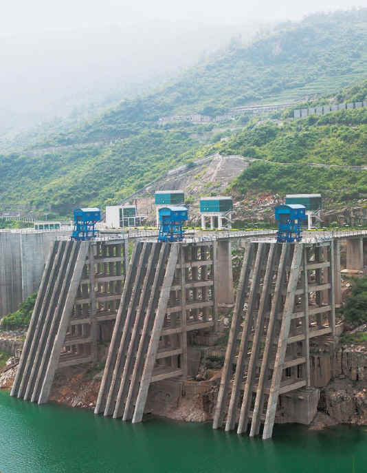 洪家渡水电站是国家实施“西部大开发”和“西电东送”首批启动的重点工程,电站位于贵州乌江上游,是乌江干流唯一具有多年调节的龙头水电站。水库总库容49.47亿m3,电站共装机3×200MW,年发电量15.59亿kW·h。工程完成主要工程量如下:土石方开挖527.59万m3;大坝填筑903.83万m3;混凝土浇筑66万m3;帷幕与固结灌浆28万m;钢筋制安3.57万t;金属结构制安6191t。 枢纽布置由钢筋混凝土面板堆石坝、左岸泄洪系统(洞式溢洪道和泄洪洞)、左岸引水发电系统(竖井式进水口、引水隧洞、压力钢管段、坝后地面厂房、GIS开关站及进厂交通洞等)组成。 钢筋混凝土面板堆石坝最大坝高179.50m,坝顶长427.79m。坝顶宽10.95m,上游坡1:1.4,下游局部边坡1:1.25,加上坝后公路平均边坡1:1.4。 洞式溢洪道进口为2孔10.00m×18.00m(宽×高)的开敞式溢流堰,堰顶高程1122.00m,设一道弧形工作门,堰后为平面收缩段。无压隧洞长756.66m,纵坡7.5%,断面为城门洞形,底宽14.00m,洞高21.54m。 泄洪洞进口底板高程为1056.00m,竖井式闸门井内设一道平板检修门,有压段末端设一道弧形工作门。有压洞直径9.80m,长度427.00m,平坡;无压隧洞段断面为7.00m×12.41m的直墙拱形,水平长度426.00m,底坡为7.5%。 引水系统采用三洞三机单元供水方式,分别由竖井式进水口、引水隧洞、压力钢管道等建筑物组成。进口底板高程1058.50m,2号隧洞上平段长386.061m,纵坡7.5%,洞径7.80m。2号压力管道长257.437m,洞径6m。 地面厂房位于坝脚左岸。主要建筑物有主厂房、上游和右端副厂房。主机间、安装场、装卸场从左至右成纵列布置。主厂房净跨22.50m,内装3台200MW水轮发电机组,GIS开关站布置于上游副厂房顶,与主变重叠布置。中控楼布置于上游副厂房右端,通过电梯与主副厂房连接。 工程于2000年11月8日正式开工,2001年10月截流,2004年7月首台机组投产发电,同年电站实现“一年三投”的发电目标。2005年9月竣工,概算总投资49.27亿元。 二、新技术应用与科技创新 (1)工程在勘察、设计、施工、管理方面有所创新和突破。在混凝土面板堆石坝方面,将国内外的新技术集成应用于洪家渡工程,在陡岸采用等宽连续窄趾板,堆石体部分采用冲压新技术,面板混凝土采用聚丙烯纤维补偿收缩混凝土加保湿养护技术防裂措施,主坝堆石采用相同压实标准以减少沉降差,陡岸坡用硬填方及增模区处理,全断面基本上平起填筑,面板浇筑前对坝体填方设定预沉降标准,左岸陡坡用直立面加宽马道开挖并用预应力锚索锁口,设置坝体纵向水平位移计监测河谷方向的变位等,都进行了全面的研究和探索,结果具有较高的价值。水电站厂房新型结构研究及应用方面,在国内首先采用大跨度墙板式新型梁柱结构,首次采用矩形钢筋混凝土柱和π形悬臂钢吊车梁组合结构,成功应用于洪家渡工程。总体上处于国际先进水平,部分成果达到国际领先水平。 (2)工程质量处于受控状态,单位工程质量全部优良,投产后能正常运行,运行单位非常满意。 (3)5年生产事故为零;施工进度比初设审定提前两年三个月;投资在增加4.8亿元情况下仍控制在原概算额度内;注意环境保护,治理扰动地面恢复植被90%以上。 (4)洪家渡工程布置上利用地形地质特点,将进口建筑物集中布置在不太稳定的顺层坡上,将结构物与边坡治理结合,节省大量工程量,泄水建筑物利用大断面洞室溢洪道,也是罕见的。 三、工程获奖
