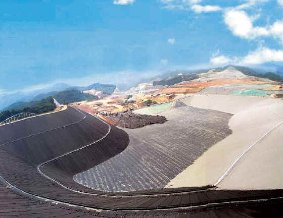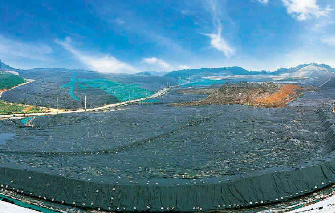 工程总占地面积为91.7万m2,分四期建设。由生活区、进场区、填埋区、渗滤液调节池、地表水沉淀池、污水处理厂、填埋气发电厂及其他配套设施组成,填埋区总容量约2000万m3,工程总投资约6.83亿元,其中征地费用约为1.5亿元。该工程分四期建设,于2000年11月动工兴建,分别于2002年8月、2003年7月、2004年9月、2006年6月分阶段投入使用。 填埋区为土方构建,上层铺设高密度聚乙烯膜(HDPE膜)。生活区与办公区建筑物为框架结构。 设计日处理垃圾2000t、设计使用年限为22年。工艺流程主要由生活垃圾卫生填埋、场区地表水环境的截洪及清污分流、渗滤液处理与回用、填埋气的导排及回收利用、封场处理等组成,其核心技术主要包括防渗系统、渗滤液处理、沼气的资源利用以及填埋区的分区建设规划等。 该项目是目前国内规模最大、标准最高、施工营运最规范的具有国际水准的现代化生活垃圾卫生填埋场,是广州市生活垃圾处理的主要场所,每天处理的生活垃圾超过6500t,为提高城市的卫生质量和环境质量起到非常重要的作用,促进了经济的发展,改善了投资环境。2004年,该工程被列为国家环境保护“十五”重点工程项目。 二、新技术应用与科技创新 (1)工程采用防渗新材料——三布两膜双衬层HDPE膜防渗系统。该防渗系统为国内高标准、高安全性的防渗系统,最大限度保护地下水免受污染。采用HDPE膜双衬层(高密度聚乙烯膜衬层)、双排水组合成的基础和边坡防渗系统,既满足卫生填埋场的防渗要求,又能增加填埋场的容积,这种防渗系统比采用传统的黏土防渗层可以使填埋场容积增加10%以上。 (2)该填埋场最大限度进行分期规划建设,从建设到运营管理建立完善的雨污分流体系,提高了建设资金使用效率,减少填埋场渗滤液产生量,为国内领先水平,同时也为国内填埋场分期建设和雨污分流树立了典范。 (3)采用填埋气收集、处理、利用新方式——气量计算模型引导下的沼气收集、处理、发电系统。该填埋场设置了填埋气体收集利用系统,并能够及时对填埋气体进行收集利用,填埋场产生的沼气收集率达到70%,可安装12台1000千瓦发电机组发电,沼气发电供场内自用,多余电量输上城市电网(目前发电量40000~48000kWh/日),一方面可实现能源利用,另一方面可减少填埋气体对周围大气环境的影响,减少温室气体的排放,目前已安装2台发电机组,总装机容量达2MW。 (4)采用渗滤液处理新工艺——生物处理(UASB+SBR)及反渗透(CMF+RO)工艺技术处理垃圾渗滤液。渗滤液处理系统采用了上流式厌氧处理(UASB)、回流序批式好氧处理(SBR)、微滤(CMF)和反渗透(RO)等四道工艺,经该工艺处理后的水质远远优于《生活垃圾填埋污染控制标准》(GB16889-1997)规定的排放标准,达到生活杂用水水质标准,出水在场内回收利用,实现污染物的零排放,节约自来水及地下水。 (5)工程在施工中采用了土方矩阵空间构筑法开挖新技术、斜边坡压实修护施工新技术、填石过程中防渗膜保护新技术、防渗膜的裁膜、铺膜及焊接新工艺、对焊缝全面检测的新措施等技术,取得了创新和突破。 三、工程获奖