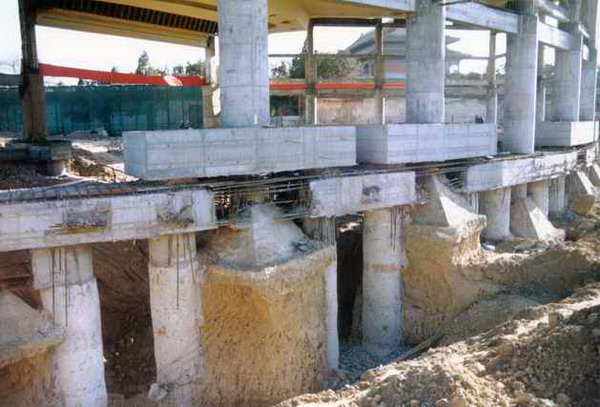 一、工程概况 北京中山公园音乐堂始建于1955年,主体结构为24根独立柱支承的现浇钢筋砼梯形屋架加现浇屋面板的框架结构,最大跨度约33m。24根支承屋架的柱均采用独立基础。 改造后的音乐堂地下一层,地上三层(局部五层),建筑面积由原来的3337㎡增加到11864㎡,新增建筑面积8527㎡,其中地下室建筑面积4000㎡。本工程原结构为框架结构,改造后结构为框架-剪力墙结构。 二、新技术应用与科技创新 该项工程较好的贯彻执行了保护既有建筑,开发利用地下资源的可持续发展方针。该工程技术先进,有较高的科技含量和创新性,总体水平达到国内同类工程的优先水平。 1、原基础下人工挖孔灌注桩成孔设计技术 为保证在大约190kPa压力的地基下进行人工挖孔桩成孔原结构基础不沉降、不倾斜,并保证成孔过程中的安全,采取如下措施: (1)挖桩时采用对称隔柱跳挖法挖桩,当第一批桩浇筑完混凝土且其强度达30%后,方能进行第二批桩的开挖与浇筑。 (2)挖每节桩土时,靠近基础一侧土最后挖去,尽可能缩短基础一侧地基土临空时间。 2、实现新旧柱间力平稳传递的技术 为实现原柱荷载向桩的传递,首先要保证柱荷载能够平稳地传给转换托梁。首先对原柱表面凿毛,剔出凹槽,采用C30混凝土加固至改造后的二层梁梁顶下150㎜处;其次,在承台梁上原柱中一定范围内,均匀布置三排斜向共24根Φ25抗拉斜筋。此斜筋在原柱中用树脂胶化学生根,在新包裹的175㎜混凝土中锚固,利用斜面拉筋在外包混凝土中的握裹力和斜拉筋用化学生根于原柱中的抗拔力及新旧柱间的摩擦力,实现了新旧柱间力在受荷情况下平稳传递。 3、分段挖土做筏基的结构自稳定设计技术 待第一段底板混凝土强度达到设计值的70%时,挖第二段土方并做第二段底板,第一段底板与桩构成一个受力刚体,第三段因基桩在地下,整段也是一个刚体,由第一段、第三段与开挖的第二段组合后仍是一个稳定性较强的受力结构整体。如此循环,直至第三段全部完成。 三、获奖单位 建研建筑设计研究院有限公司,北京城建七建设工程有限公司 |