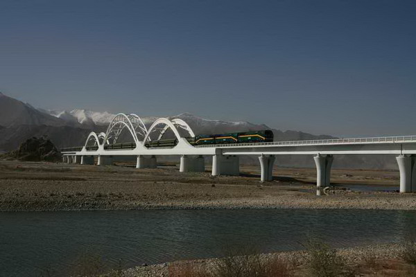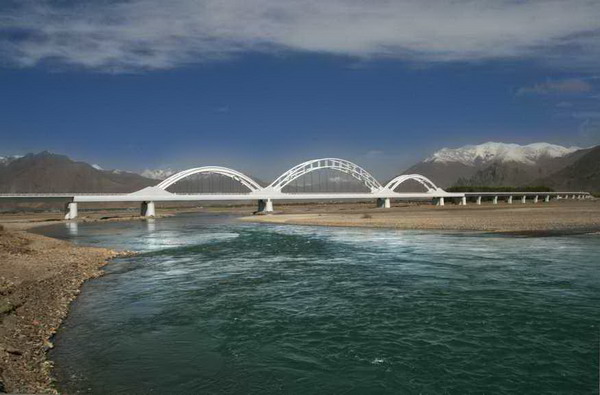 一、工程概况 青藏铁路拉萨河大桥地处拉萨市,距青藏铁路终点拉萨车站约2公里,距拉萨市中心约5公里,是青藏铁路标志性工程之一。大桥全长928.85m,共23孔,主桥结构为(36+72+108+72+36)m连续梁钢管混凝土五跨三拱的组合体系,其中(72+108+72)m为三孔下承式钢管混凝土系杆拱桥。线路等级为单线Ⅰ级标准,客车最高行车速度120km/h。该桥于2003年5月开工建设,2005年8月25日通过铁道部组织的交工验收。 二、新技术应用与科技创新 1、该桥设计构思新颖,结构布局合理、美观,与民族文化相得益彰,与自然和谐。在铁路建设中采用连续梁与钢管系杆拱组合体系做为承重结构是较为少见的,有独到之处。主桥系杆拱宛如皓白的哈达,飘舞在青山碧水间,变截面连续梁仿佛连绵起伏的雪山,托起皓白的哈达。主桥桥墩采用变截面圆柱墩,象牦牛的骨骼充满活力,引桥桥墩采用变截面雪莲花状桥墩,与上部结构优美的曲线风格相统一,体现了浓厚的民族建筑风格。 2、该桥针对高原高寒缺氧、紫外线强、风蚀严重、日温差和阴阳面温差大、气候特别干燥等独特的自然环境,在结构耐久性方面采用多种新技术确保了桥梁的经久耐用。 3、在施工中创新了基础施工、高原地区混凝土灌注养护等施工工法,保证了大桥高质、按期建成通车。混凝土养护,采取三阶段养护方法,第一阶段是混凝土初凝至脱模阶段,浇筑完后,用彩条布遮阳,以防止混凝土阴阳面温差过大;第二阶段是脱模阶段,脱模时环境温度与混凝土表面温度、混凝土表面温度与内芯温度温差不得大于15℃后方可拆模,边拆模边覆盖;第三阶段养护方式是采取包裹式保湿、保温方法,养护时间不低于60天; 三、获奖单位 中铁大桥局股份有限公司,铁道第三勘察设计院集团有限公司,西南交通大学 |