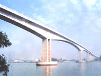 一、工程概况 洛溪大桥是l05国道广州市与番禺市交界的一座特大桥,它跨越广州港出海的南航道7000吨海轮通过。大桥全长1916.04米,其中主桥长480米,为(65十125十180十110)米不对称四孔连续刚结构1988年建成通车。洛溪大桥主桥主跨180米的连续刚构桥,按同类桥型,在当时居世界第六,亚洲第一。 二、新技术应用与科技创新 洛溪大桥设计时依照当时桥梁向着无支座少伸缩缝的趋势发展,从技术经济上比较选定(65十125十180十110)米四跨不对称连续刚构为主桥结构。在桥型的发展、设计水平的提高、施工工艺的严格要求和新技术的采用上都有创新。 1.首先确定了"主桥要先进,引桥要经济"的设计原则,主桥依航道要求及河道制约采用4跨不等连续刚构,上部构造与墩身刚性连接,省去大吨位支座,引桥布置经济合理,采用简支T梁体系,桥面连续构造。实践证明所定原则正确,使用性能好。 2.先进合理的主桥结构体系 针对已定的主航道中心线,特定的河面宽度,为满足通航要求,尽可能全河宽达到不同吨位船舶综合使用,选用不对称的连续结构,既方便施工、减少水中基础,又不破坏现有河堤。尽管增加了一些设计难度,但使得在整体布局上得当,外观美观大方,视野开阔。洛溪大桥也是我国第一座大跨连续刚构。在此以前,国内预应力桥仅限于设计和建筑T构和连续梁,它的成功,使得连续刚构这种既经济又合理的桥型在我国全面推广应用。同时改变了梁桥的经济跨径,在此以前跨径超过200米时一般采用斜拉桥,而现在跨径超过300米才用斜拉桥,在200。300米之间连续刚构桥型比斜拉桥优越。 3.经济合理的箱梁断面型式 主跨180米的连续刚构是当时我国采用悬臂施工跨径最大的预应力桥梁,此类桥型自重所占比例大,为此首次引进大吨位预应力体系(最大张拉力4360kN)。顶板预应力钢束全部在承托锚固,取消上齿板,有效地减小箱梁断面尺寸,为大跨径连续刚构桥发展创造了条件,其跨中梁高3米,仅为跨度的1/60,为世界先进水平,国内最高水平。 4.桥墩当时在国内首次采用双墙式薄壁墩,提高了墩身的柔性,改善了主梁的受力性能。 5.主墩上设有漏斗型钢围堰作为主墩的防撞设施。钢围堰设计采用二次碰撞原理,从而减少了钢围堰工程量,同时人工岛使下部桩基和承台施工变水中为水上施工,极大地改变了施工条件,加快了施工进度,这样构思独特的防撞岛结构也是国内首创。 6.引进大吨位预应力体系和大型伸缩缝装置 洛溪大桥根据受力情况采用三向预应力设计,全部纵向预应力和横向预应力束采用引进的7丝钢绞线的VSL公司预应力体系。纵向预应力束采用了VSL公司的Ecs31型锚具,极限张拉力达到5704kN。以前我国一直采用张拉吨位仅为580kN落后的弗氏锚具,使我国桥梁的最大跨径一直停留在110米左右,设计者在洛溪大桥首次大胆引进外国先进的预应力体系,使我国梁式桥跨越能力由最大跨径110米一跃发展到180米。洛溪大桥引进了H09et公司的大型伸缩装置,经安装测试满足设计要求,性能良好,这也是本桥引进新技术一大特点。 7.自行研制C1DO通用公路架桥机,能使预制的T型梁在曲线上直接安全就位,技术性能先进,加快了施工进度。 8.高墩爬升模板利用墩身结构钢筋作为爬升支承是新的创造,施工简易,快速,省工省料,加快施工进度,在国内也是第一次使用。 9.简易轻型的贝雷托架(1#块),设计构思考虑先浇的第一层(底板)砼与贝雷托架形成两种材料结构的组合梁,共同承受后浇的腹板和顶板自重从而达到托架简便、经济,也是国内桥梁首次采用,经济效果很好。 10.洛溪大桥获得全国优秀设计金质奖等十一项奖项。同济大学桥梁界著名专家项海帆院士?"洛溪大桥的建成为我国预应力桥梁建立了一个新的里程碑"。洛溪大桥的确在推动和发展我国预应力桥梁方面起到革命性的率先作用和推动作用。 三、主要获奖单位 广东省公路勘察规划设计院 中交公路规划设计院 广东省长大公路工程有限公司 |