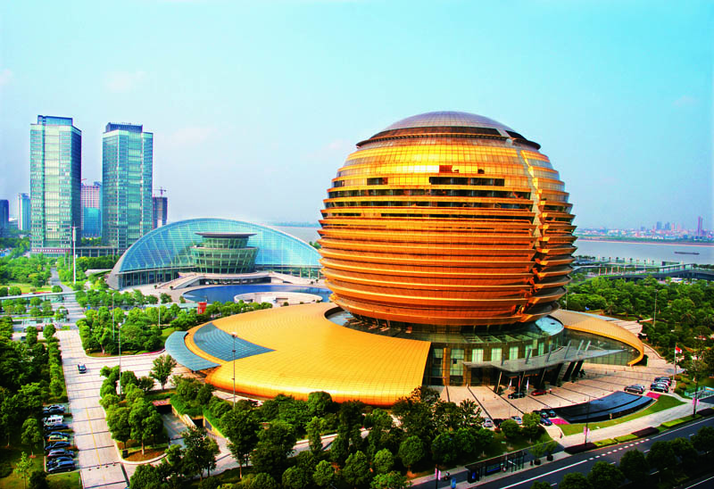 该工程位于杭州市核心区,总建筑面积126296m2,是集会议、餐饮、住宿为一体的大型综合体建筑,由地下室、椭球形裙房、球形主楼三大部分组成,为国内最大的钢结构球形建筑。