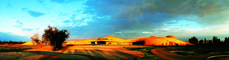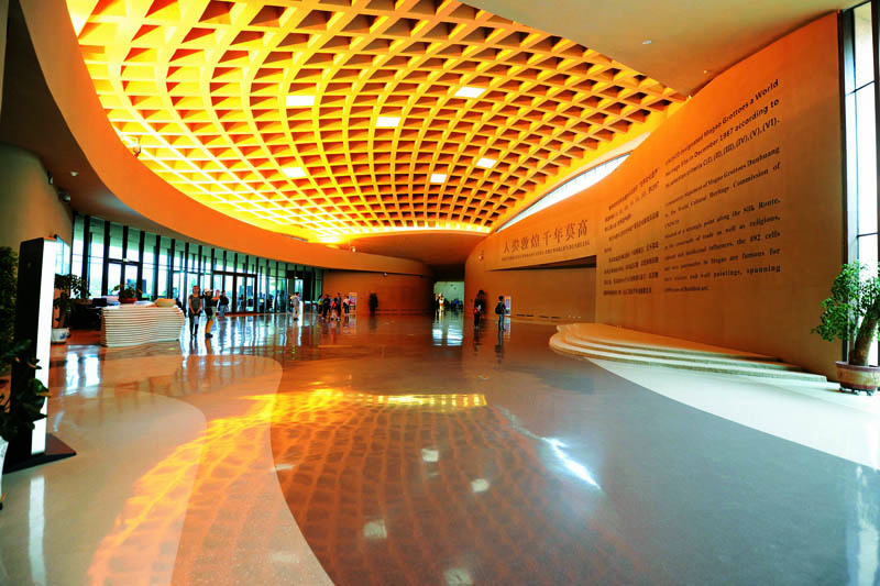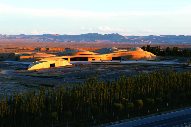 敦煌莫高窟保护利用工程——游客服务设施建安工程位于敦煌市,由游客中心、中心广场及停车场等组成。项目占地150亩,游客中心东西长220m,南北宽110m,形如流动的沙丘和“飞天”的裙带,主体建筑面积11825m2,最大建筑高度16.1m。是一座集接待、观影、休憩、餐饮、购物、交流学习于一体的全弧线、全曲面钢筋混凝土特色艺术建筑。
