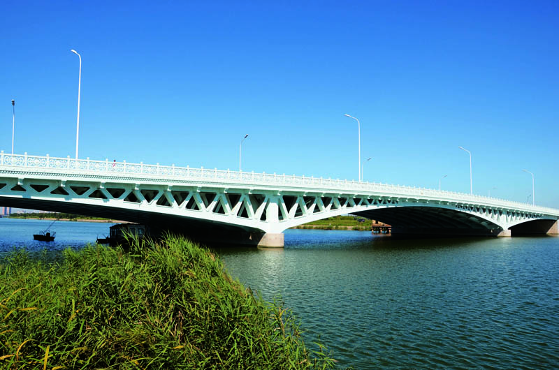 吉兆桥工程位于天津市天钢柳林地区,跨越海河,是海河中游后五公里提升改造的第一座过河桥梁,全长907m,主桥跨径布置为55m+90m+55m,桥宽40m,为三跨变截面连续钢混组合桁架桥。