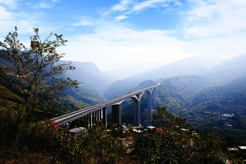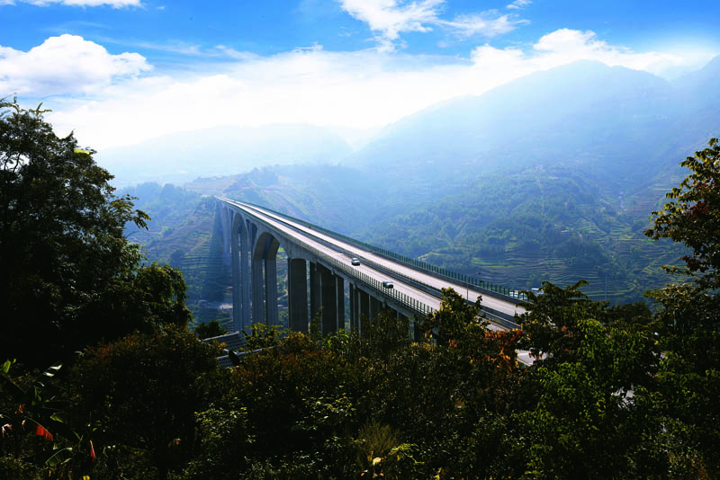 220m+82.5m空腹式连续刚构桥。全长1261m、最大墩高170m。大桥跨越北盘江大峡谷,结构复杂、新颖,规模庞大。