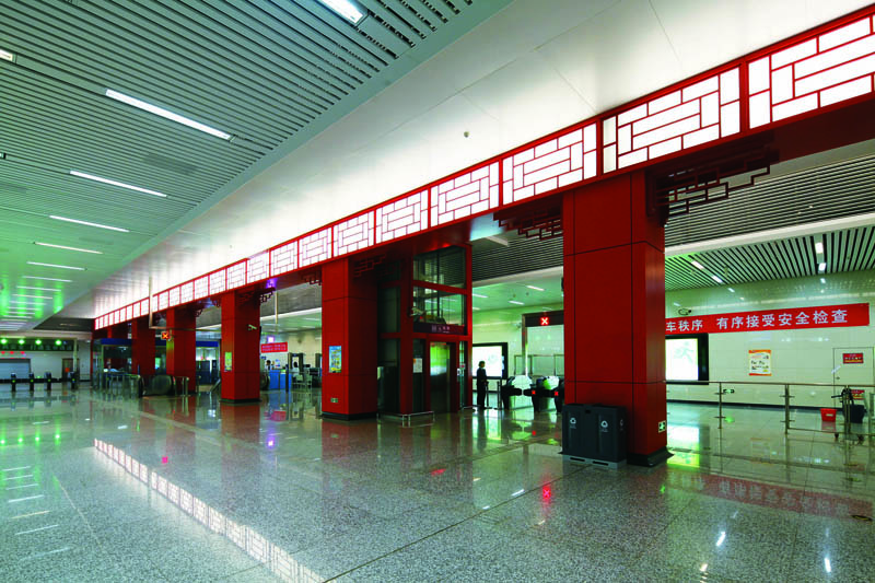 5. 高架站创新采用全封闭鱼腹岛式站台,实现了候车区与轨行区隔离,避免了风沙雨雪影响,改善了乘车环境,缩小了建筑体量,节能效果显著。