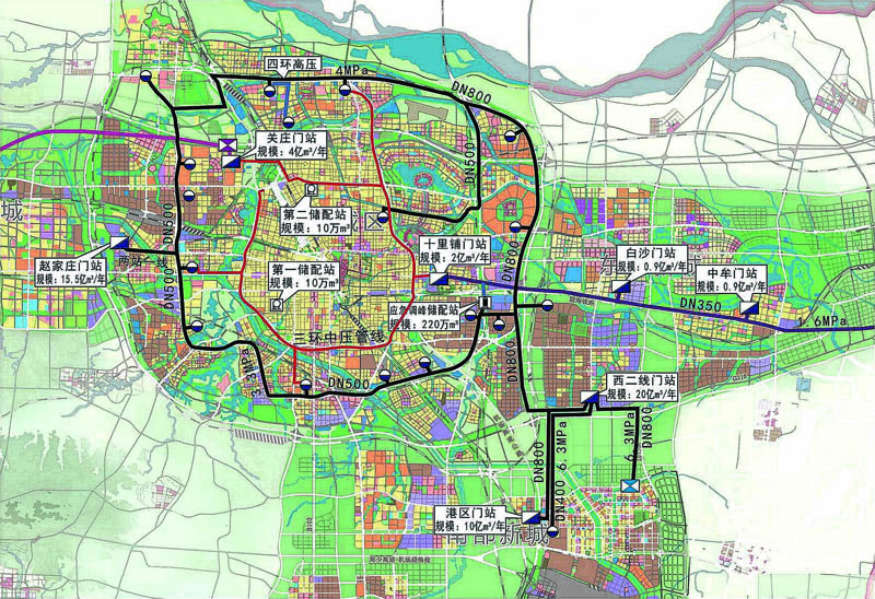 该工程是国家“西气东输天然气工程”的下游城市配套工程。工程依托不同阶段的项目可研、课题研究和专项规划,按照“总体规划、分步实施、综合利用”的指导思想,坚持建设运营统筹、技术管理并重的原则,建成了“两环、四级、多气源、多通道”的燃气输配系统。