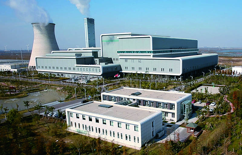 本工程生活垃圾低位热值设计值为7118kJ/kg(1700kcal/kg),垃圾低位热值设计值变化范围为4,606〜9,211kJ/kg(1,100〜2,200kcal/kg)。垃圾焚烧炉引进国外先进的往复式机械炉排炉,单台焚烧炉处理能力为750t/d,设四台焚烧炉和两台30MW凝汽式汽轮发电机组,为四炉两机配置。烟气净化工艺系统采用“炉内喷尿素水(SNCR)+干法(消石灰)+活性炭吸附+袋式除尘器+湿法(NaOH溶液)+烟气再热”工艺,烟气排放满足欧盟2000标准。