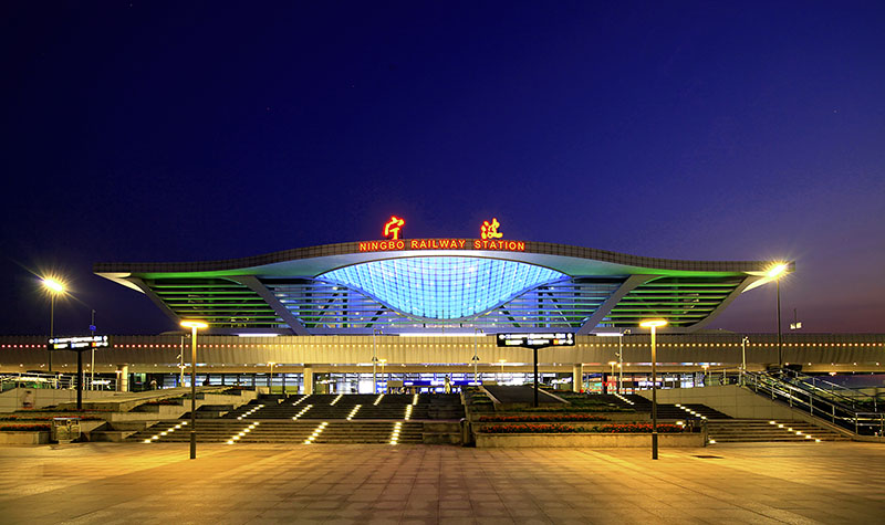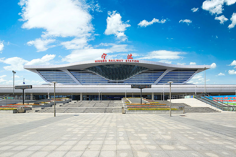 宁波站为改建站,总建筑面积为202810m2,是国家“八纵八横”铁路客运专线上的一个大型综合交通枢纽,真正实现了铁路、公交、地铁、出租车、长途汽车等“零换乘”的设计理念。宁波站的建成开启了陆上丝绸之路的“新起点”。