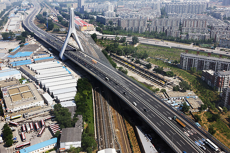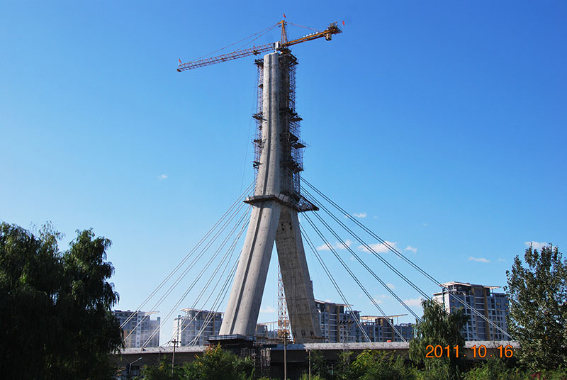 受北京市区征地拆迁、铁路和地铁正常运营等条件限制,该工程采用单点顶推法施工,顶推段梁长212m,顶推距离达213m,单点顶推重量25000t为世界之最,是世界首座采用单点顶推法施工的曲线混凝土斜拉桥。顶推梁63m的悬臂刷新了国内曲线混凝土箱梁顶推的记录,大跨度斜拉桥混凝土曲线箱梁长距离、单点曲线顶推施工技术达到国际先进水平。