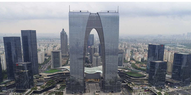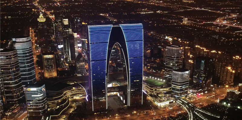 东方之门以其独特的设计理念享誉国内外,由两栋超高层建筑组成的双塔连体建筑,是至今为止世界最高、体量最大的拱门式建筑,在其穹顶建设具有古典韵味的空中苏州园林。东方之门位于苏州市的中心区域,也是国内首个开放创新综合试验区—苏州工业园区的核心位置,东临金鸡湖,南眺独墅湖,西瞰姑苏城,北望阳澄湖。苏州地铁1号线、6号线在此交汇,拥有高级住宅、五星级酒店、公寓式酒店、高端写字楼、大型购物中心等多种业态,满足了市民工作、生活、社交、娱乐等多种需求。