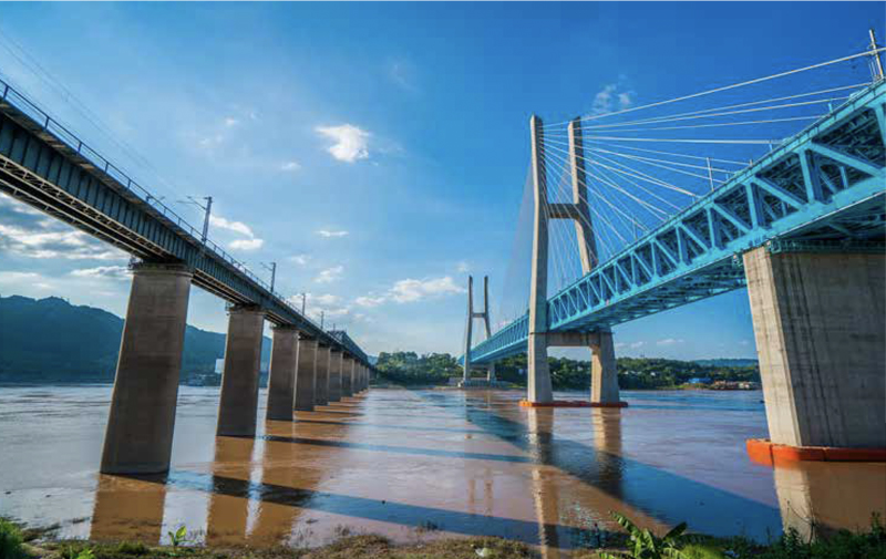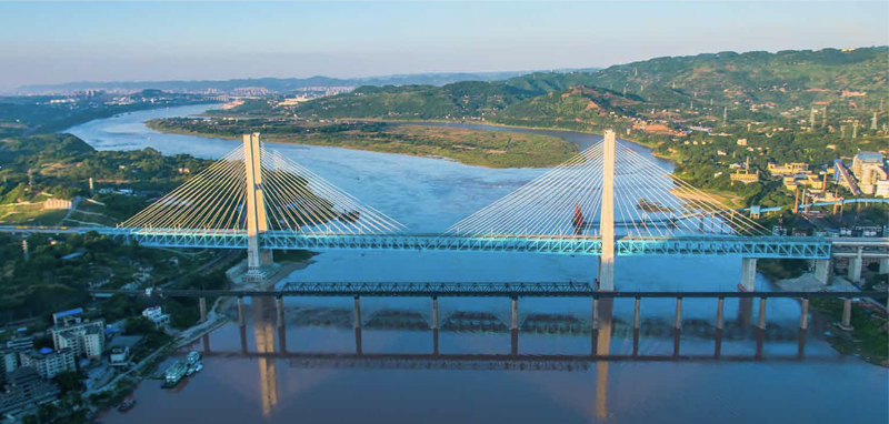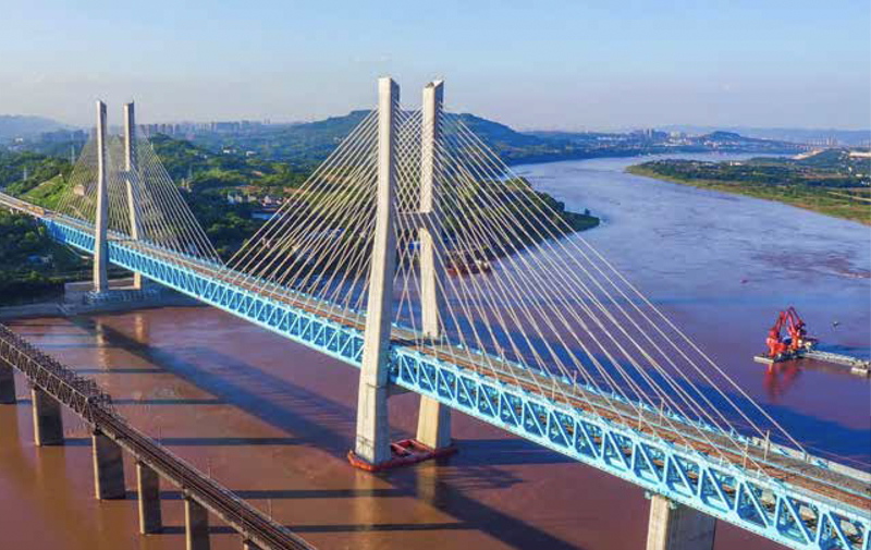 新白沙沱长江大桥主桥是世界上首座跨度最大、荷载最重的六线双层铁路钢桁梁斜拉桥。大桥集“六线、双层、双桁”特点于一体,是现代大跨度铁路斜拉桥新型结构的集中体现。
