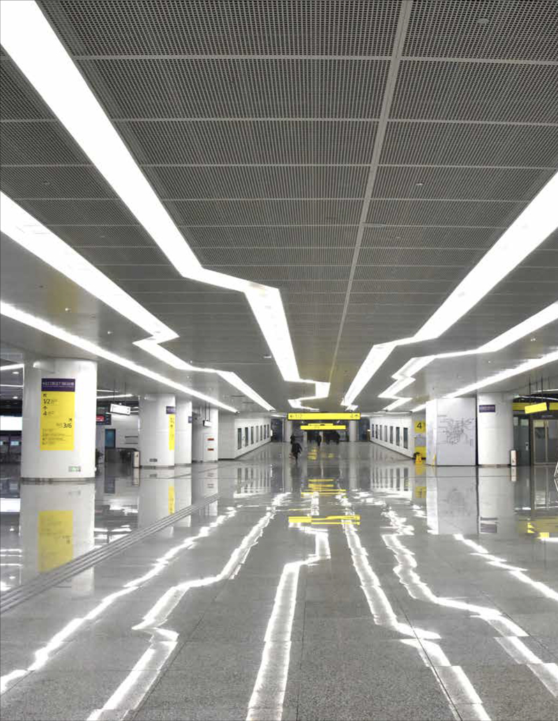 6、达成了节能环保可持续发展的建设目标。统一规划上盖物业开发与地铁建设,同步实施,节约土地26.96公顷,增加可开发建筑面积87.4万m2;国内首次全线采用单端集约通风系统,缩短车站结构5m,结合高效照明系统、组合式弧形蜂窝铝板幕墙技术,综合节能达30%。