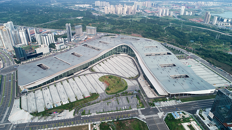 2.国内率先采用金属屋面与室外展场重载透水混凝土地面雨水回收联动体系,将海绵城市理念完美融入绿色会展建筑。