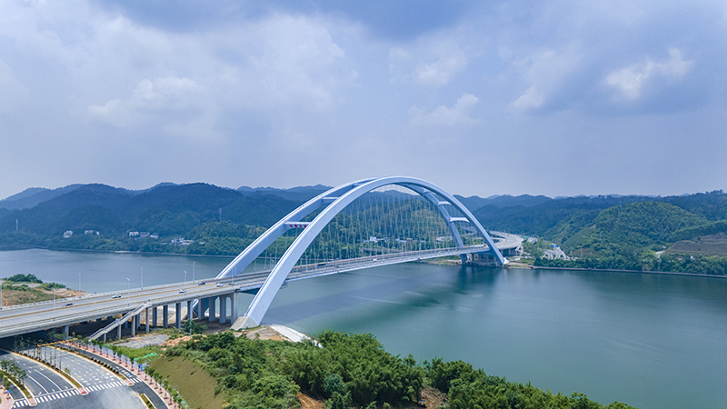 该工程是目前世界第一大跨度有推力钢箱拱桥。结合拱肋节段重、吊装高度高、空间异形对位难、地理环境复杂、施工区域受限、拱座基底与相邻柳江常水位高差大等特点进行技术攻关,研发形成了多项先进技术。