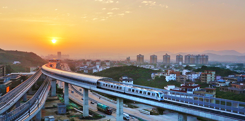 本线路运行距离长、功能定位多,采用全天候快慢车+主支线贯通运营模式,实现精准运输和差异化服务。高架段采用长大区间大跨度、无支座、全刚构体系桥梁,跨线段采用大跨Y形连续刚构拱桥,标准段采用4×40m预制节段拼装全刚构体系桥梁,相比传统箱梁,结构轻巧,节省全寿命周期支座运维成本;高架站采用钢混组合结构,减小建筑结构体量、提高空间利用率,运用装配式建造技术提升建设效率,节能环保。地下段多处穿越富水岩溶发育复合地层、花岗岩残积土、淤泥质土等不良地质,岩溶段见洞率66.7%、最大洞高12.5m;浅覆土下穿20世纪70年代浅基础老旧房屋群516栋、流溪河9次、高速公路桥梁7次,与已运营地铁 3号线,竖向最小间距仅3.14m,盾构施工难度大。