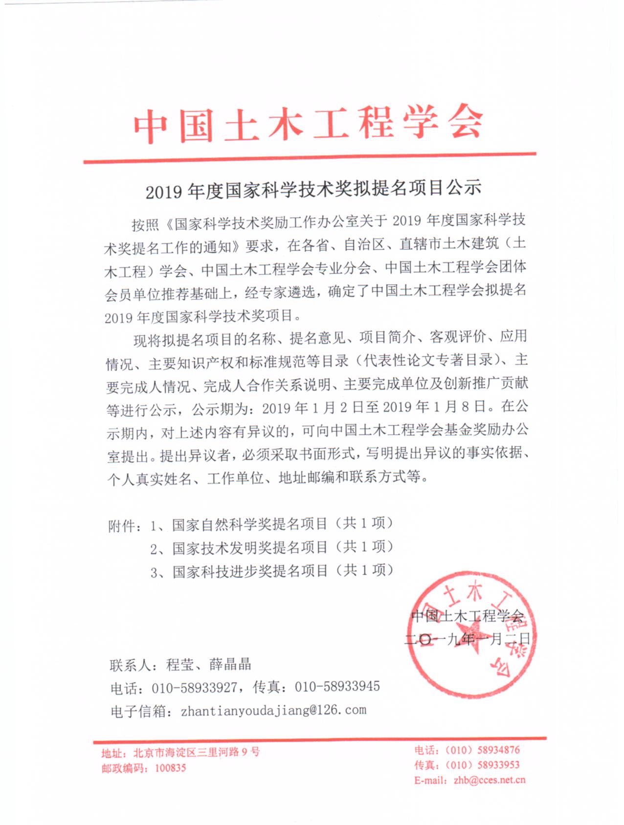 现将拟提名项目的名称、提名意见、项目简介、客观评价、应用情况、主要知识产权和标准规范等目录(代表性论文专著目录)、主要完成人情况、完成人合作关系说明、主要完成单位及创新推广贡献等进行公示,公示期为:2019年1月2日至2019年1月8日。在公示期内,对上述内容有异议的,可向中国土木工程学会基金奖励办公室提出。提出异议者,必须采取书面形式,写明提出异议的事实依据、个人真实姓名、工作单位、地址邮编和联系方式等。