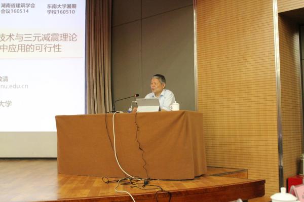 简短的开学典礼结束后,暑期学校第一讲正式开始。在东南大学吴智深教授的主持下,中国工程院院士、湖南大学陈政清教授为学员们首先进行了题为“电涡流阻尼减振/震技术与三元减震理论及其在建筑结构中应用的可行性”的专题讲座。陈院士结合大量工程实例,从板式电涡流调谐质量减震器(TMD)及其应用、弹性力-阻尼力-惯性力的被动减振三元理论、电涡流大型轴向阻尼器的研制与特性、多层建筑以及大型隔振结构的应用等方面进行了详细地阐述。
