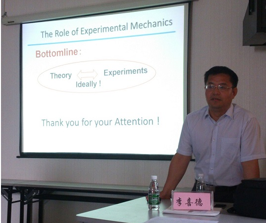 上午,李喜德教授主讲的题目为“变形测量:从光学干涉到强度和光谱图像”。李教授首先对光的干涉、衍射做了详细的解释,介绍了实验固体力学中的主要光测方法及分类,并举例介绍每种测量方法的应用。然后,李教授对变形场的强度图像测量方法、变形与内部微观结构的光谱与射线测量等内容进行了说明。最后,李教授通过“Bird and Frog”的故事,引导学员们思考自己的科研道路。